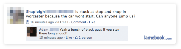 Does it matter though? Shit still stinks. The depressing, “blak ppl commitin crime lol” tone of the above just bummed me out a little, that’s all – along with the tacit approval of lamebook itself. but i’ll shut upp now anyway, coz there’ll probably be a picture of someone vomming along pretty soon anyway. “LOL”!!