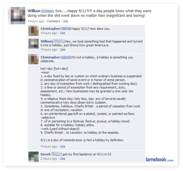 Loving how Christopher argues that 9/11 is not a holiday, then proceeds to define holiday as ‘any day of exemption from work’.