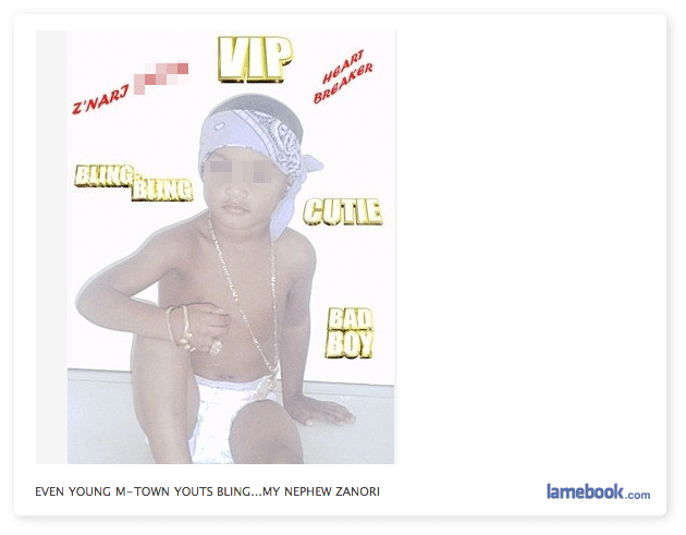 OMG that baby photo??!! Are you TRYING to set your child up for a future career as a drug dealer/pimp? Guess so, cuz it’s so “gangsta.”