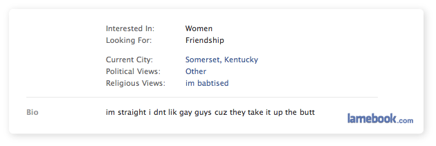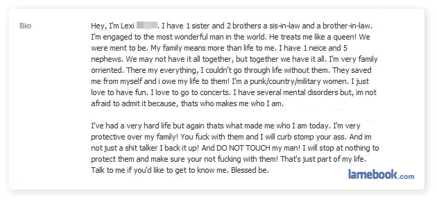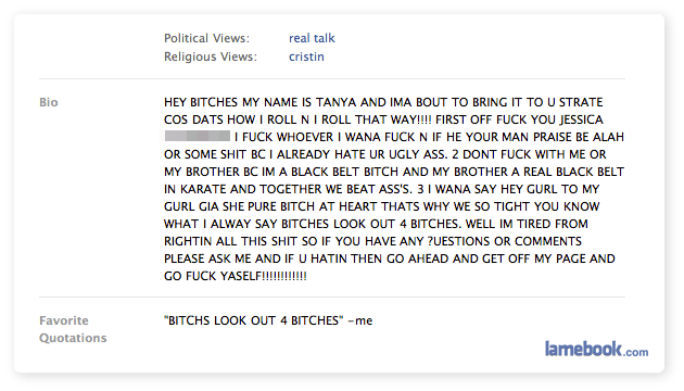Maybe all these bios on Lamebook that are exactly alike can serve as a public service announcement that if you are a self-admitted proud bitch, you are not unique so shut up.