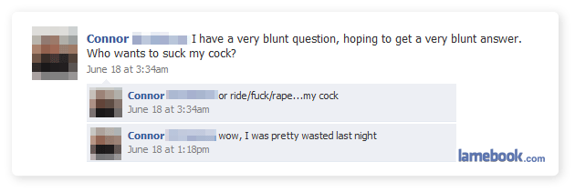 Using this handy delete feature seems much more prudent than replying to your own drunken idiocy, thereby drawing even more attention to it than it probably got when you posted it originally at 3:34 AM, when most normal people are asleep or at least not on Facebook.