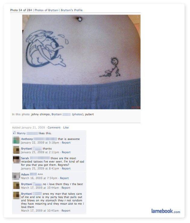 And Bryttani….I HOPE her tattoos don’t actually represent real people. Please let it be that she’s just a complete idiot who thinks fondly of her tats & talks about them as though they were actually representatives of live individuals. PLEASE. She brings ludicrous tats to a whole new level.