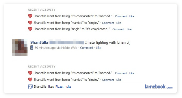 28. I’m not particularly traditional when it comes to relationship labels, but I’m pretty sure that this type of relationship status change is really just a cry for attention (or is a drama queen). Can somebody REALLY go from married, to single, and back again, in one fell swoop? I’m starting to think nobody should be allowed to put their relationship status on Facebook! Or maybe you can only change it once a month, maximum. I’m going to go start a fan page…