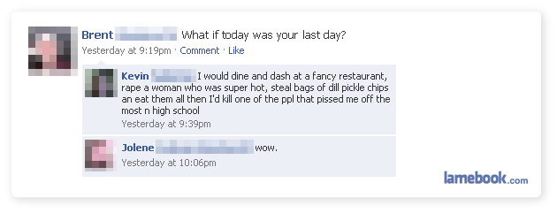 Yeah, ok ‘Sensible’. I’d spend my last few hours trying to track down anything I could snort or smoke because those are the fine folks whose pock-marked and toothless faces I’d want to see last, and oh, the joy of throwing down random ass and taking what I want. Wait, why wouldn’t I just save time and rape the drug dealers? That would be sweeeet!