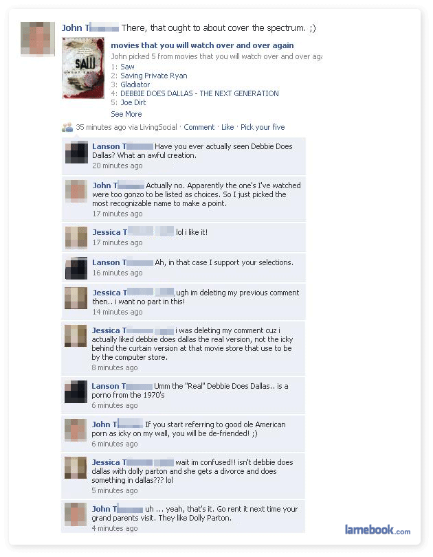“Debbie does Dallas” – a classic, seen it a couple of times, but as far as porn goes, there are better. “Deep throat” is a personal favourite. I relate to Linda Lovelace more.