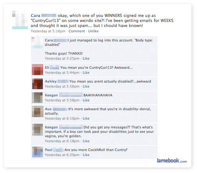 One of my high school friends had a habit of filling out coupons for embarassing/sick things in magazines and newspapers in other people’s names and sending them off. More than one of my friends got “free information kits” on fungal infections, sexually transmitted diseases, obscure religious groups etc.