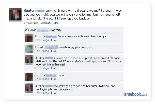 When Hunter mentioned that summer break was a cheating whore and he would never get to see her again, I would have asked him whether he was going to kill himself. Then I would follow up with some encouraging words like, “If you do it soon enough, you won’t have to put up with winter either! That bitch be cold.”