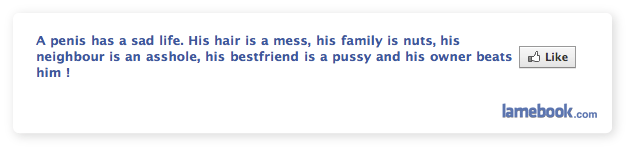 That penis joke has been around since [insert something old here] but for some reason it has really started getting around lately. And I agree with mcowles, Lamebook is being a bit judgmental with that Homopedonecrobeastiality group.