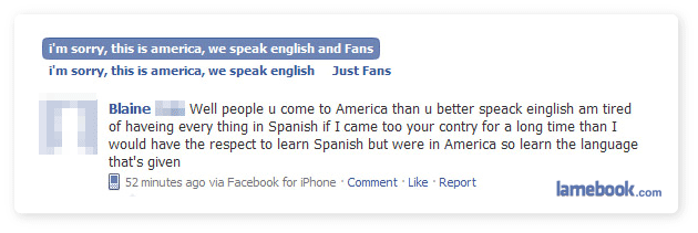 How are Blaine or any of the other “Speak English!” people who keep showing up on Lamebook (which, by the way, got old the second, third or twelfth time) being hypocrites? None of them are saying “This is America–learn how to write well.” Blaine and others are concerned with conversational English, which is drastically different from correctly-written English. Just because you use bad grammar on the Internet–like 95% of the world’s population does–doesn’t mean you can’t speak English and therefore don’t have any business telling others to learn to do so.