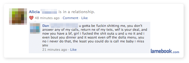 Way to go, Dan. Most women are really attracted to the whiny desperate stalker type; she’ll dump her boyfriend to be with you for sure now!