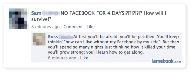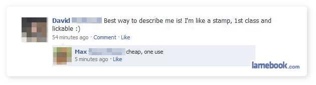 3 and 4 were okay and the last one is just well kinda dumb jokes like that are made every time….I sent one in bout my friend saying how his butt was numb and his mom randomly said did u know 2 of ur family members died….but i also had me saying im so sending this to lamebook and him yelling at me oh no your not…well i did but it never got posted….I guess we arent sending good posts in so they use the dumbest they got
