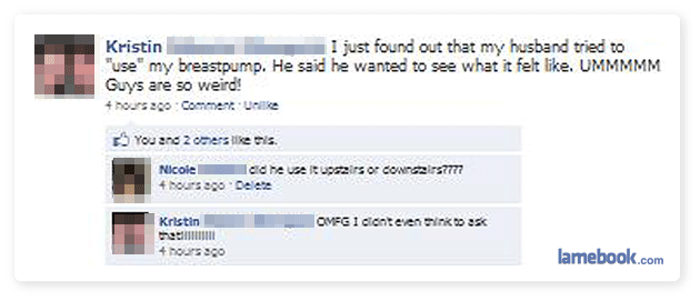If her husband was to borrow her breast pump, she assumes there’s an equipotent chance of him using it on his tit OR perhaps dong, but she has no idea which one might potentially feel better for a guy. Yea guys are pretty weird, you’re totally right, one minute we are thinkin’ with our dicks, the next we are performing all the computational activity in the areola area. Crazy men.