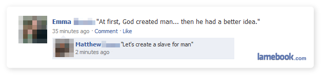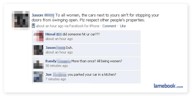 I don’t see why people think these people continue to think that these sexist “jokes” are funny. Just like “your mum” jokes, these lost their humour. I don’t understand why lamebook proceeds to post the same jokes in different context. It’s shameful on lamebook’s behalf.