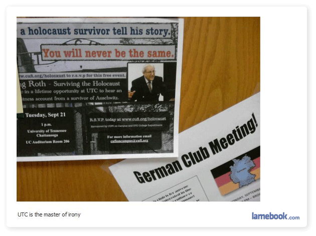The first one isn’t ironic at all. The German club would probably talk openly about the Holocaust and encourage people to go see that presentation… Unless the lameness is implying that having these two posters together is ironic?