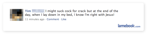 So, wait a minute. Is Tim actually admitting to trading sexual favors for crack on Facebook? Like, is he outting himself? Or is that common knowledge among his “friends,” that he “suck[s] cock for crack”? If it’s the latter, I think I’m actually more intrigued by his circle of friends than by his admission.