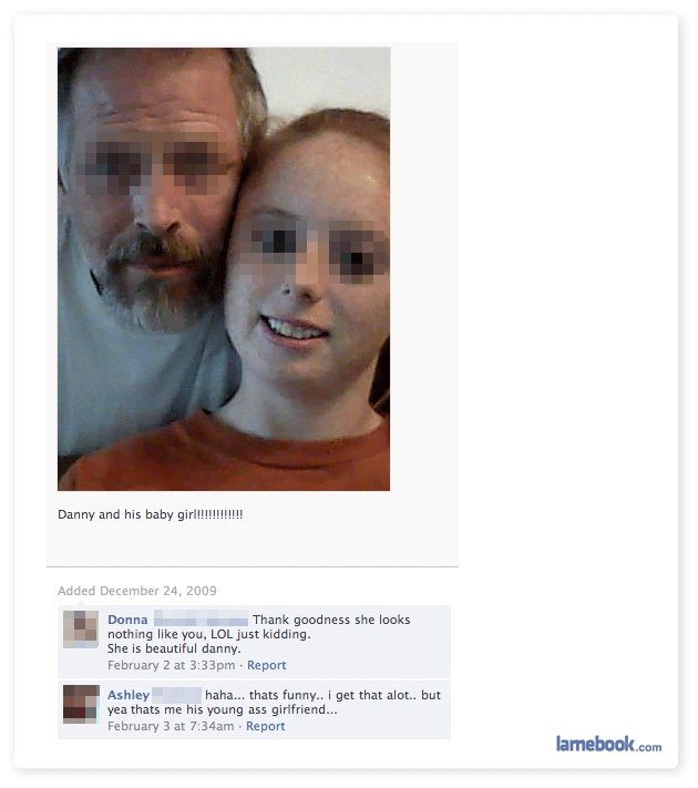 Ashley: Yeah, people think I’m his girlfriend all the time because we don’t look much alike. I’m going to use sarcasm now so I end up on Lamebook where everyone will assume my dad is a child molester and I’m a victim!