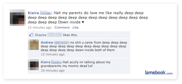 “LOL I was talking about my grandparents,my mom is, like, dead!!!1!!1 pmsl!!”