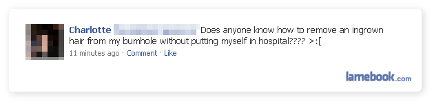 I am the ingrown hair girl. Except there was no ingrown hair, my dear (soon to be ex) friend took over my account when I was working on an essay and this is what she produced.