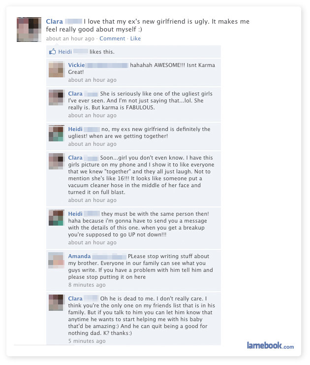 I’m so happy for Clara that she feels good about herself when she looks at her moron ex’s new girlfriend and thinks “wow, she’s really ugly”.