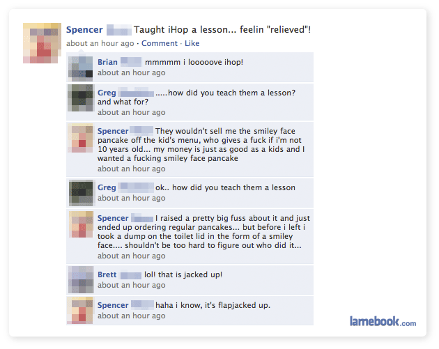 If I were Spencer’s Facebook friend, iHop would have his address and contact number.