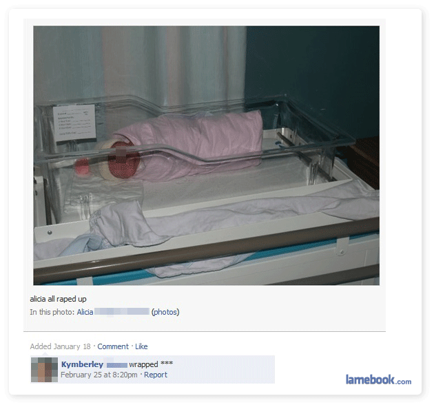 Considering that it is “Alicia” that is all wrapped up, and that a person called Alicia has been tagged in the photo, it is highly likely that this baby has been given the misfortune of having parents who think that it is cool to set-up a facebook account for a child that has no choice in the matter. Hopefully she won’t get circumcised as well.