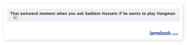 17. @ MsBuzzkillington, I’m not trying to be a dick but even though it’s called “lamebook” it’s supposed to make you chuckle. Otherwise what point would it really be? The above posts aren’t really funny. And then you said that the Holocaust one was kinda funny so you too, expect to laugh, so why is it lame to point out that lamebook lowered the bar a bit?