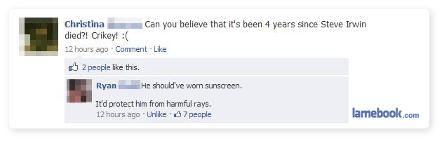 That Steve Irwin joke is so stupid. I was wearing a t-shirt about sunscreen once and some idiot told me that joke….. it actually took like a full 10 seconds to process how lame he was. Not cool.