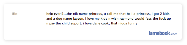 hi everyon1, the nic name teo. U cal me dat cuz im a foot fetishist who cant spel good, i got 2 kids whos names i forgot n a cat named wiskers. i love my kids n wish brittini wud fess the fuck up n idmit dat im the dad n not dat fukr jason from walmart. i love dane cook, that stand up comedian is unquestionably one the funniest human beings alive today – also, does anyone NOT love Rob Schneider?