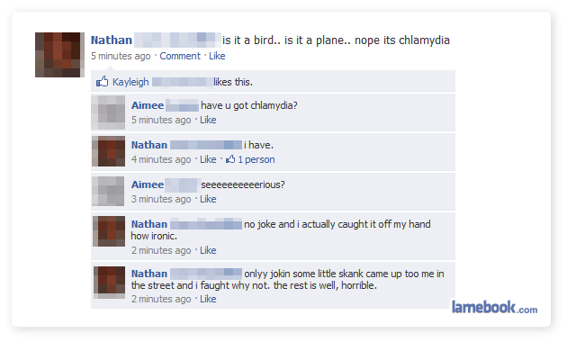 Nathan’s post about chlamydia sounds like a great way to break bad news to someone “Is it a bird? Is it a plane? Nope, Grandpa just died”