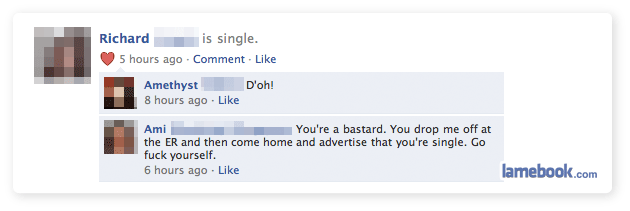 Here’s a possibility, Richard posted something about being single. His ex read it and made her comment. He then changes his status just to drive the nail home… Just a guess and yes, I have dated alot of jerks…