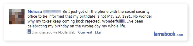 Melissa’s status is ripped off of Fmylife. That status was the top of their most liked list. Lame.