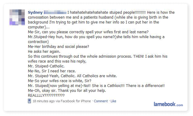 Thanks to Lamebook, the English speaking world now has new ways to spell both “retart” and “stuiped”. Who says you can’t get learn-ed on the internetz!
