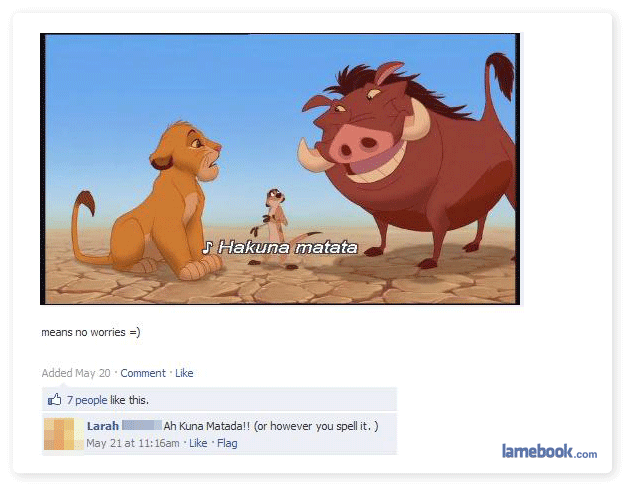 I agree she does redeem herself by saying she does not no the correct spelling, I was just curious because I was not sure if she was correcting the photo or not…(Because if she was that would of meant my hole childhood was a lie singing Hakuna matata)