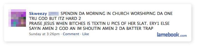 I REALLY wish I didn’t look at his wall. His friends are examples of pure genius: ” CUREN$$Y OVA FEMALE DOG$. YO NOTICE HOW DER AREMORE $$$$ IN CUREN$$Y THAN DOG$. THAS CUZ MAKIN THEM DEAD PRESIDENTS LIKE OBAMA AND ARNOLD SWARCHINAGER ARE MORE IMPORTANT”…