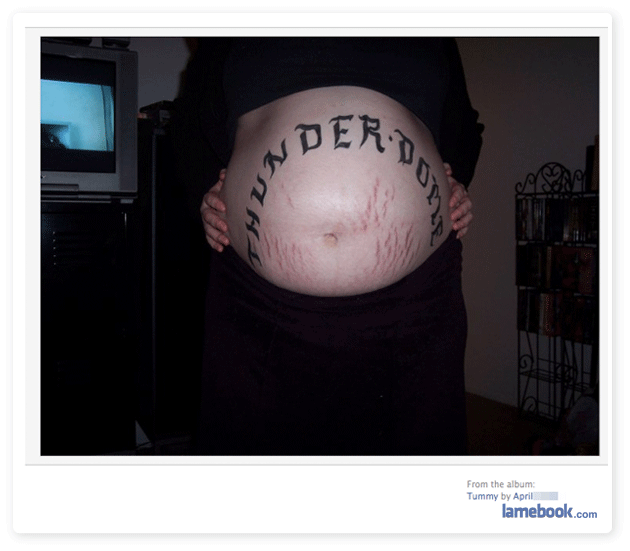 Theda…whoah there, don’t take it so personal! I don’t care why or how the first pic was submitted, and I’m not picking on just her. I just generally don’t like stretch marks. And yes, I’ve been traumatized by a pregnant woman…ME! lol Lighten up! so some of us hate belly shots, some of us love them. Whatever! it’s lamebook! we all just say whatever.