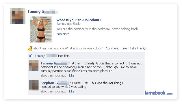You kids are so lucky with the Facebook quizzes. It’s so much cleaner. I was made to be the quiz taker for my mother’s sexual proclivities. Crayola doesn’t make a box big enough to hold all the colors of dear old mom, but if I had to choose one, I guess I’d go with loose bowels.