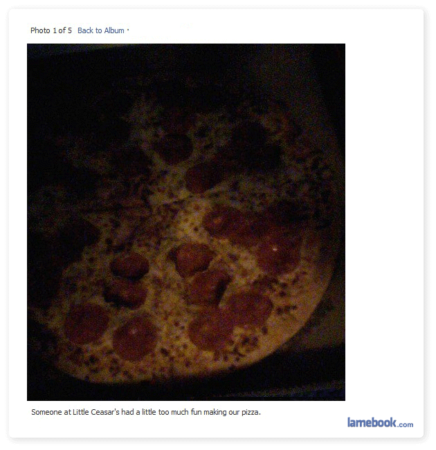 The pizza one is lame, but not in a good way. I’m no pizza expert, but I’m pretty positive that’s how you position pepperoni (alliteration, nice), to ensure each slice has the same number, makes it easier to slice, etc, etc.