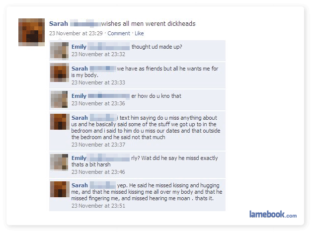 Nah, I just hang around guys who don’t focus only on sex and being physical when they actually care about a girl. If most of my guy friends really cared about a girl, the first thing that comes to mind (at least that they’d say) when you ask what they liked or miss about her is not anything sexual because she meant more than that. If they go directly to the physical stuff, it’s because that’s all it was for them (or because they’re still pissed off about the breakup). Honestly, that’s all I mean. If you still don’t get that, I’m sorry, I can’t explain it any better.