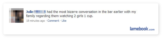 2 girls 1 cup…It’s terrible, really fucking terrible, even by my standards, which are flexible. It was kind of like a car accident with many fatalities, and when you drive by you don’t really want to see what’s going on, but you can’t help yourself. Then you REALLY don’t want to see it, but you can’t look away. I was scarred for life…