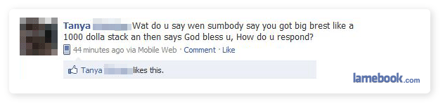 Tanya has one brest (breast)? And it’s worth a “1000 dolla stack”? Good for her! I’ve always wanted one brest (breast) worth that!