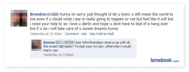 Surely Brandon did not post that on his mother’s wall? Please tell me Brandon posted that on his gf’s wall, and his mother merely commented on it.