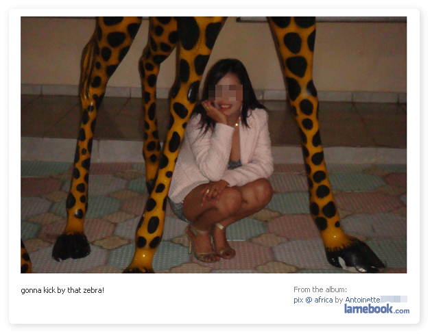 I’m encouraged that the foxy fuck piece in the last picture can’t tell the difference between a giraffe and a zebra, it means she might fall for the good old ‘Elephant Routine’