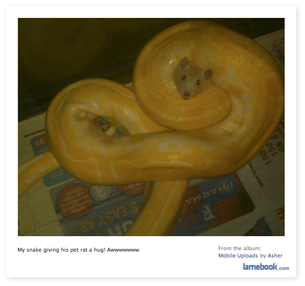 You people are the whiniest bastards ever. First of all, everyone feeds live rats to their snakes… it’s how they do it in the wild. Second of all, if you whining fatties hadn’t complained about the girl picture, I could be getting lulz right now. Go DIAF.