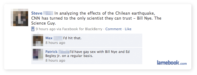 Having sex with Bill Nye would be hysterical. He’d be pounding away, while saying, “You know, the penis is actually muscle and nerves that contract when the male becomes sexually aroused. It’s quite amazing. The largest penis ever measured was 26 inches, and it’s possible to increase the size of a penis by hanging weights from it. Some tribes in Africa pierce their members with Acacia thorns as a coming of age ritual.”