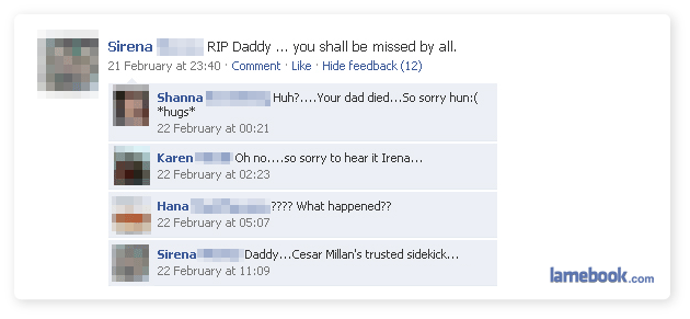 LOL on the RIP Daddy- the same thing happened to me. I felt bad that a friend of mine lost her dad, and it was Cesar Milan’s pit bull that died. I felt pretty stupid after I posted that I felt sorry about her dad…