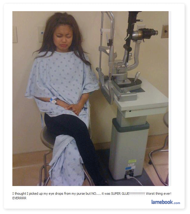 I really feel for that girl in number 3….I don’t wear glasses nor do I use eye drops….or use fake nails…but I do feel for her situation – also I think she just got it in one eye and has the other closed to avoid attempting to open the glued one.