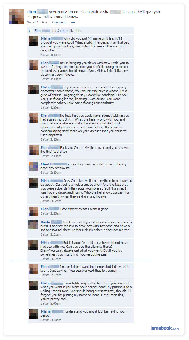 & regarding the herpes situation- People here have found all this info on herpes already. Ellen had the same opportunity to use google and educate herself enough on sexually transmitted diseases to avoid a situation like this. She “wanted to get laid,” got herpes, and blames Misha. Typical. Then announced it on facebook! She’d be handling this differently if she cared half as much as some of the commenters do.
