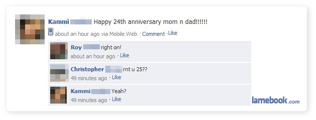 OHHOHO! THAT GIRL’S PARENTS MARRIED A YEAR AFTER SHE WAS BORN! OH MY GOD. OH GOD THIS IS CLASSIC LAMEBOOK. TOMORROW MAYBE WE CAN HAVE A STATUS FROM SOMEBODY WHO WAS ONLY RAISED BY ONE PARENT! ONE PARENT! THINK OF THE MADNESS!