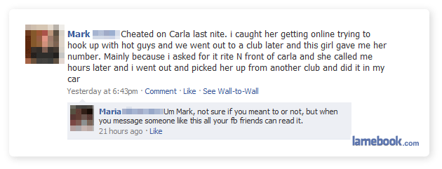 My first thought was that Carla hacked Mark’s account and posted this as part of her revenge for Mark cheating.
