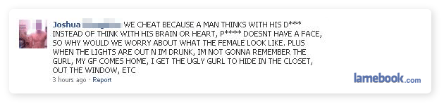 He might still have been fraped and the pissed-off gf either a) found out about the automotive escapade or b) followed his ass after he got another girl’s # right in front of her. Either that or he is, in fact, a big enough dumbass to have posted that himself.